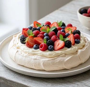EXPERIENCE THE MAGIC OF A CLASSIC PAVLOVA! CRUNCHY ON THE OUTSIDE, MARSHMALLOWY INSIDE, AND TOPPED WITH A RICH MASCARPONE CREAM AND A GORGEOUS ASSORTMENT OF FRESH MIXED BERRIES. THIS LIGHT AND REFRESHING DESSERT IS A REAL FINE DINING EXPERIENCE YOU CAN MAKE AT HOME! 👨🍳✨