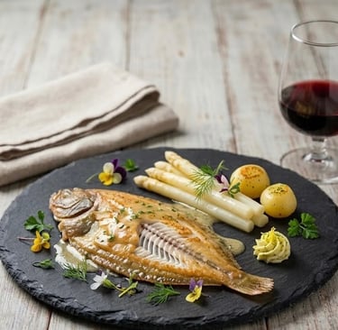 5. THE FINISH: Pour the hot lemon butter over the fish. Garnish with steamed white asparagus and edible flowers for that signature fine dining look.