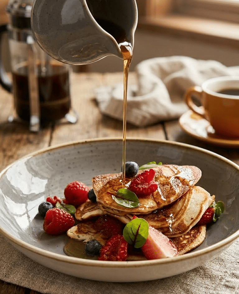 Bring the serving pitcher filled with warm maple syrup to the table. In front of your guests, pour the rich syrup from the pitcher in a continuous stream directly over the center of the pancake stack, allowing it to pool slightly among the berries, capturing the exact moment shown in the photograph. Serve immediately with fresh coffee.