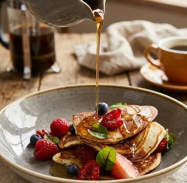 CLASSIC AMERICAN BUTTERMILK PANCAKES WITH FRESH WILD BERRIES AND MAPLE SYRUP DRIZZLE