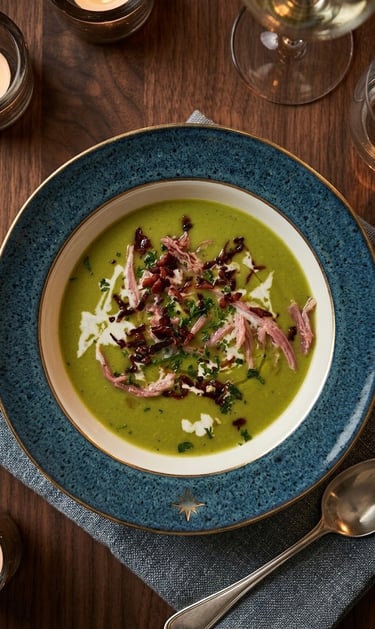 a refined culinary experience with this vibrant green pea soup, featuring a silky texture enhanced by a touch of cream and topped with salty, golden-brown crispy ham for the perfect balance of flavors and sophisticated presentation