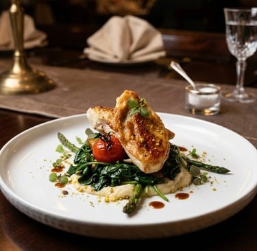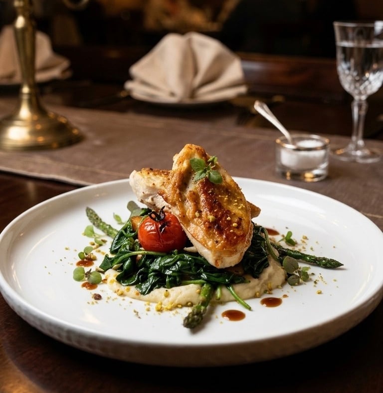 This fine dining-inspired dish features succulent, herb-roasted chicken breast served on a velvety bed of creamed spinach and a smooth parsnip purée.