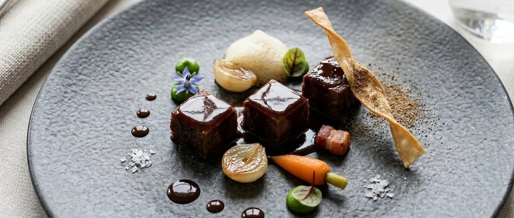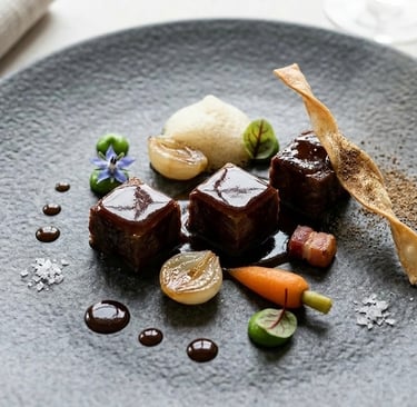 experience a french classic elevated to fine dining perfection. our modern take on beef bourguignon features tender, slow-cooked prime beef glazed in a rich red wine reduction, paired with caramelized pearl onions and a silky potato espuma. this minimalist plating brings out the deep, bold flavors while keeping the dish light and sophisticated. it’s tradition meets art on a plate.
