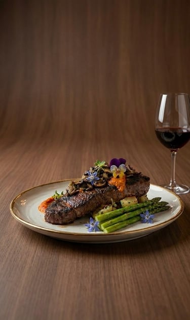 "indulge in a premium dining experience with this beautifully seared new york strip steak, served with perfectly roasted potatoes and fresh asparagus, a combination that will surely delight your senses!"
