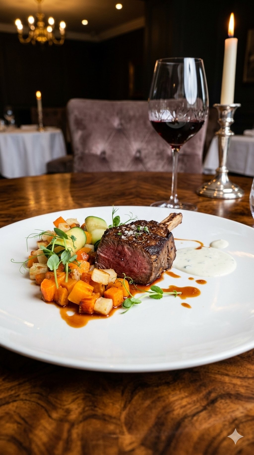 B Elevate your home dining with this exquisite veal chop, cooked to precise perfection using a reliable sear-to-oven method. A thick-cut, French-trimmed veal chop is first pan-seared to develop a deep, golden-brown crust, locking in its delicate, mild flavor, and then finished in the oven. It is presented over a flavorful hash of roasted orange and white sweet potato cubes, sautéed in a rich jus. The dish is balanced with a light, hand-rolled zucchini slice filled with micro-herbs and finished with a smooth, zesty Horseradish Crème, which adds a beautiful kick to the delicate veal. A perfect main course for an impressive fine-dining experience at home