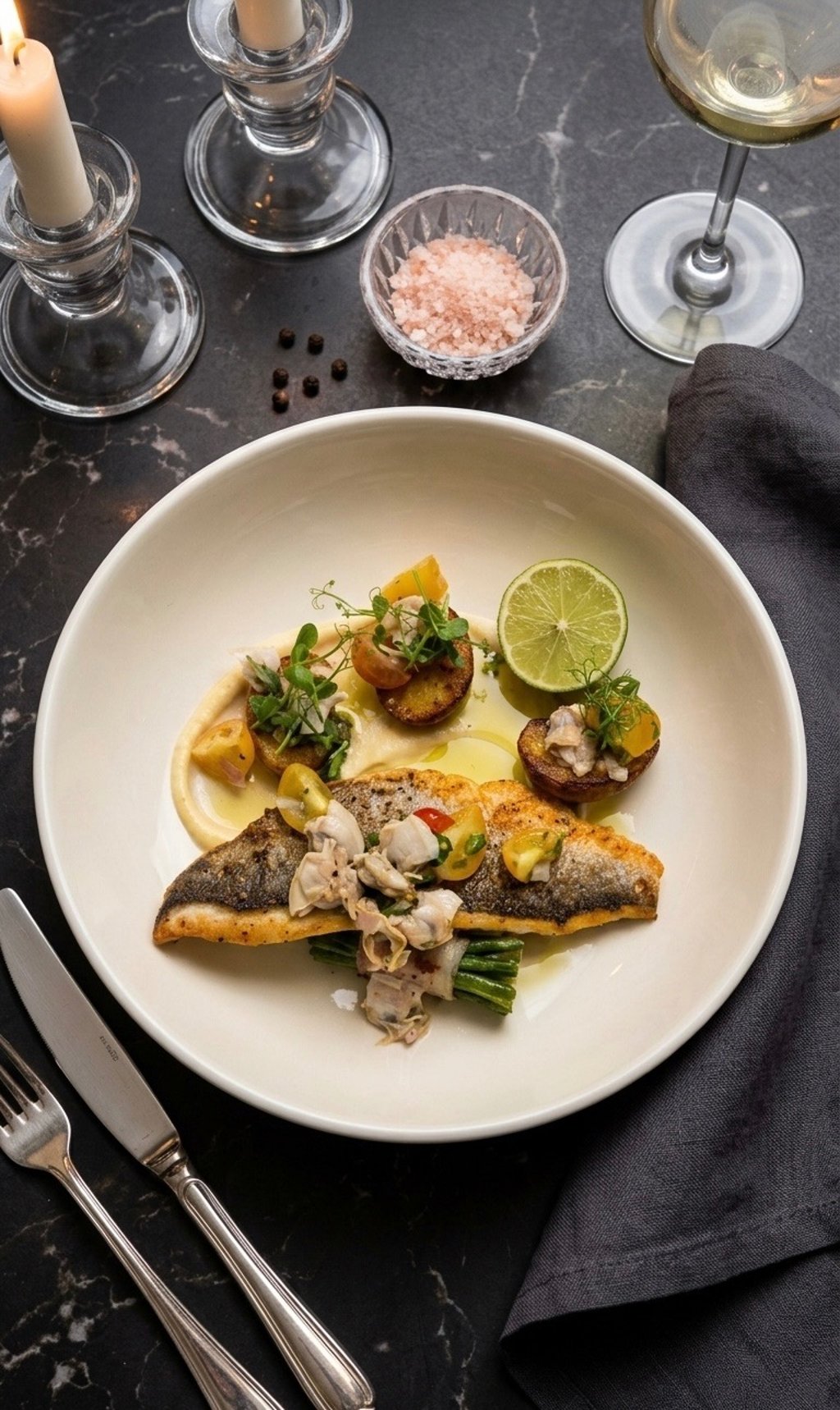 To plate, spoon a generous base of the Cauliflower Silk. Place the crisp-skinned bream fillet over a bundle of pancetta beans. Artfully arrange the warm clams, fondant mushroom caps, and cherry tomatoes around and over the fish. Garnish with fresh pea shoots, the lime half, and a drizzle of cold-pressed olive oil. Serve immediately, accompanied by a glass of wine and flaky salt.