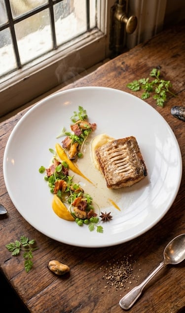 indulge in this sophisticated plate of pan-seared hake fillet with its perfectly crispy skin and delicate white flakes paired with succulent mussels and a smooth pea and pancetta garnish the dish is beautifully balanced with a silky potato mash and bright vegetable accents all presented on a clean white plate in a cozy sunlit kitchen setting that makes this fresh seafood dish look as incredible as it tastes