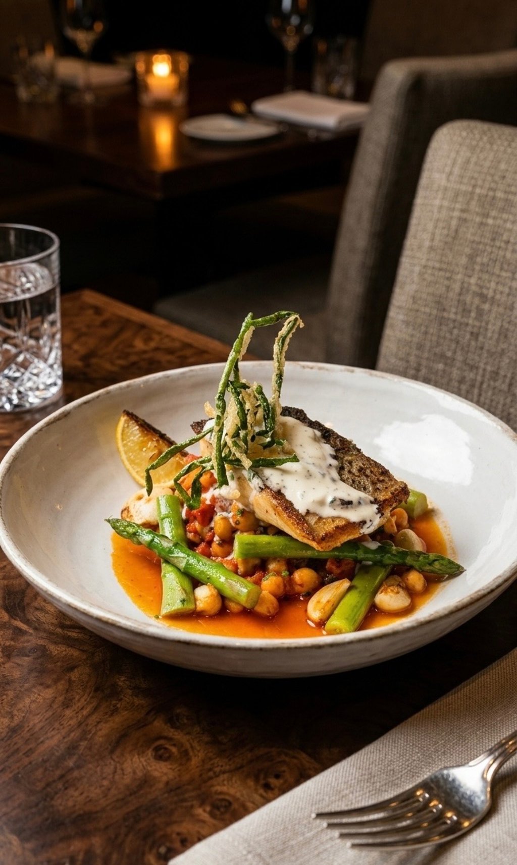 elevated Mediterranean fusion with this pan-seared sea bass, served on a robust and vibrant bed of smoky chorizo and chickpea ragout, balanced by fresh asparagus and finished with a cooling citrus cream for a sophisticated dining experience.