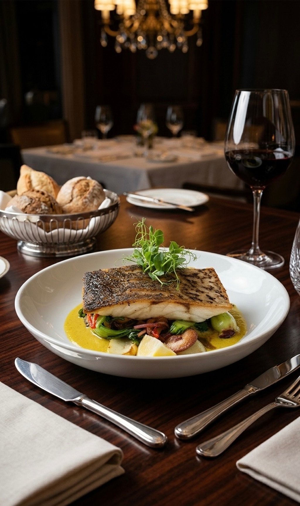Elevate your dining experience with this restaurant-quality dish that celebrates the delicate textures and bold flavors of a perfectly cooked stone bass. The natural density and firm flake of the stone bass are the stars of the show, finished with an impossibly crispy skin. It rests atop a curated bed of sautéed seasonal vegetables, all surrounded by a vibrant and creamy yellow curry velouté. Finished with a fresh lemon wedge and delicate pea shoots for a stunning presentation. This dish is a true celebration of elegant presentation and sophisticated flavors, guaranteed to impress.