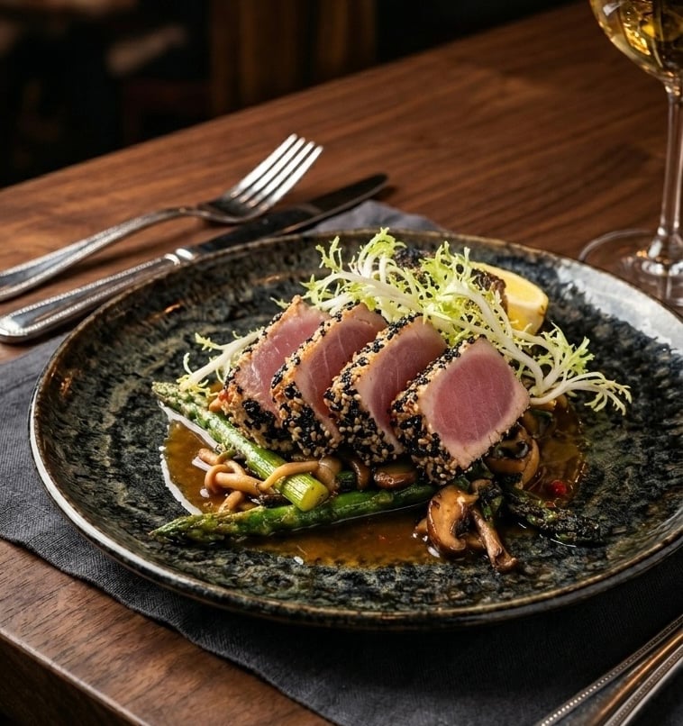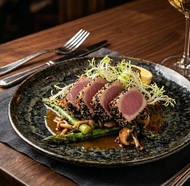 Elevate your next dinner party or romantic evening with this sophisticated and delicious dish. Our Perfectly Pan-Seared Sesame Tuna features a thick, juicy, medium-rare tuna steak crusted in aromatic sesame seeds and served over a bed of tender asparagus spears and earthy wild mushrooms.