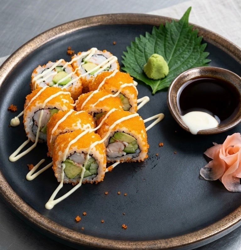 3. COATING: Gently press the Tobiko onto the outer rice layer. This adds a vibrant orange color and a delightful "pop" texture to every bite.