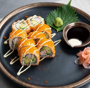 DISCOVER the exquisite harmony of textures in this premium Uramaki roll, where succulent king prawns meet the buttery richness of ripe Hass avocado. Encased in perfectly seasoned, vinegared Koshihikari rice and adorned with a vibrant layer of crunchy Tobiko, each bite offers a sophisticated balance of oceanic sweetness and creamy depth, finished with a professional touch of Japanese mayonnaise.