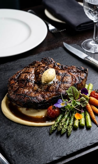 PREMIUM RIBEYE STEAK, expertly grilled to achieve a deep, savory crust while maintaining a juicy, melt-in-your-mouth interior!
