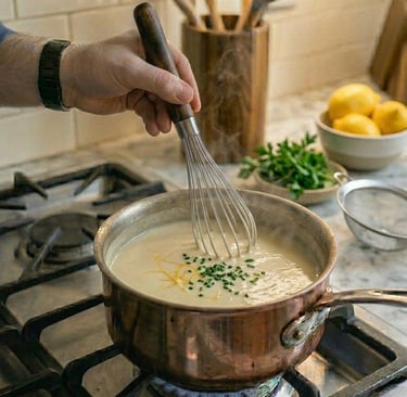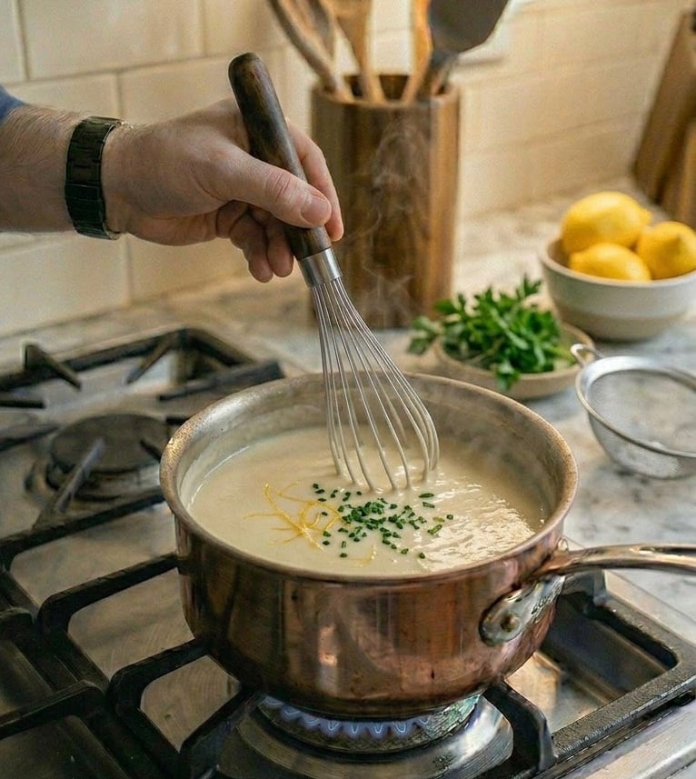 DISCOVER the timeless elegance of a flawless, shimmering Velouté sauce, prepared to a delicate, edge-to-edge silky consistency. This recipe transforms a simple "white sauce" base into a luxurious culinary experience, starting with the immediate, highly responsive heat of a traditional copper pot that prevents scorching and guarantees a smooth, mirror-like quality. Our precise method ensures an enriched, pale roux foundation, subtly cooked to remove raw flour notes without adding color. Art meets flavor with our professional finishing touches: a final garnish of fresh, fine-cut chives and a thread of lemon zest, added right as the sauce reaches its peak for a vibrant, powerful visual impact. It is a true symphony of taste and technique, designed to be the sophisticated cornerstone of your homemade cooking.