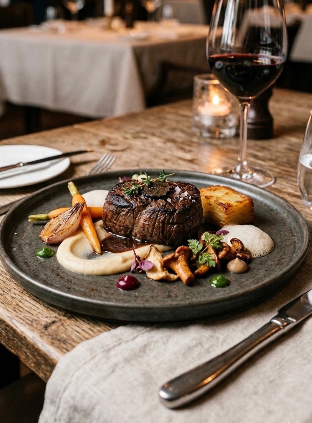 Savor the artistry of fine dining with this exquisite image of a perfect Filet Mignon. This whole, perfectly cooked tenderloin is beautifully plated on a rustic wooden table within a dimly lit, high-end restaurant, surrounded by a delicate arrangement of baby carrots, wild mushrooms, a rich purée, potato pavé, and foam.